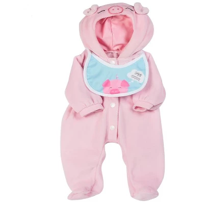 - This 2-piece outfit comes with a pink ultra-soft microfleece onesie with easy snap-on buttons and an ADORAble hood with an embroidered pig face and cute pig ears. Even comes with a removable blue, white and pink bib with a pig graphic that says, Pig Out!.