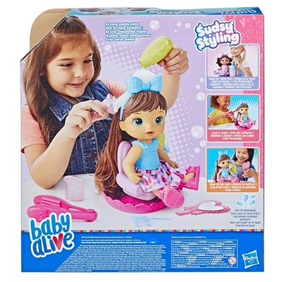 - SO MANY BUBBLY HAIRSTYLES: Style doll’s hair with suds that come out of her bow! With Baby Alive Sudsy Styling doll, kids can sit their baby doll in her styling chair — just like going to the salon