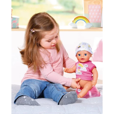 This Lil Girl baby doll offers lots of imaginative play for tiny tots aged 2 years onwards. The smaller version of our BABY born doll comes with over 6 functions including drinking water, crying tears, going to the potty and she can even go in the bath, so is lots of fun for little mommies and daddies. She also has flexible arms and legs so she can sit and little ones can change her clothes easily. When she is tired little ones can lie her down and watching her eyes close. Baby born Lil Girl wears an adorable pink romper with bunny, cloud and rainbow print, with matching hat to keep her little head warm. Also includes potty, diaper, bottle, plate with spoon, pacifier and birth certificate for lots of imaginative play. No batteries required. Suitable for children aged 2+.