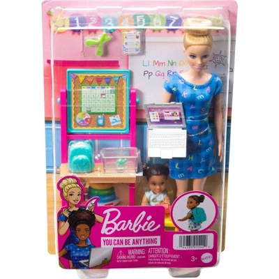 - 路Barbie teacher doll has a laptop so she can help her students learn virtually, too! There’s even a classroom pet turtle who comes in a clear, open container