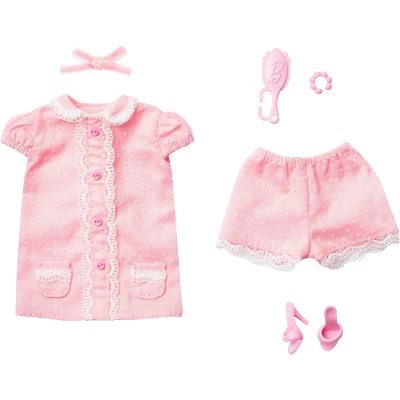 - Adorably vintage, the third fashion features sweet details like pink buttons and lace trim for the perfect night’s sleep. A satin bow, hairbrush, and pink heels complement the dreamy pajama set.