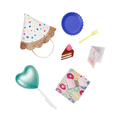 - Decoration Accessories: Includes a doll-sized party hat, heart-shaped balloon with handle, slice of cake, plate, fork, giftbox, and birthday card.