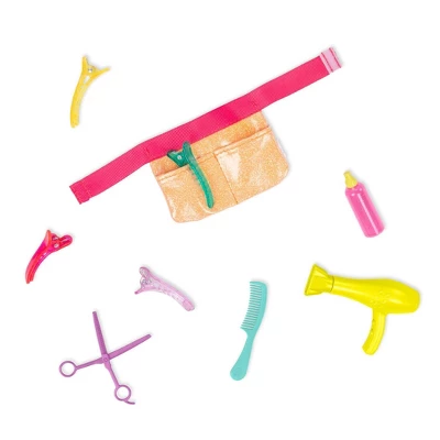 - Styling Accessories: Features a pretend blow dryer, 4 hair clips, a pair of scissor, comb, spray bottle, and a stylist apron to neatly hold her styling tools.