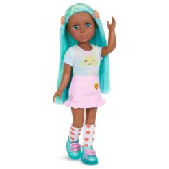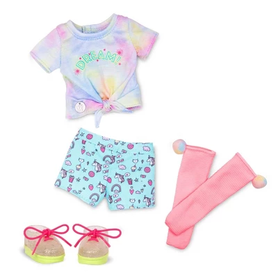 - Colorful fashion: wears a tie-dye, tie-front T-shirt with DREAM print, cute shorts with magical designs, knee-high socks, and glitter shoes; outfit has easy-open closures to quickly put on and remove.