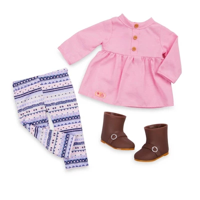 Sparkle on the ice with Our Generation Deluxe 18-inch Doll â Katelyn, a beautiful posable doll with bright blue eyes and long golden blonde hair with a side part. Whether sheâs doing axel jumps and figure-eights on the skating rink or getting to know a mountain town during a blizzard, Katelyn brings kindness and friendship to everyone around her. Follow along with her adventures in her storybook âBlizzard on Moose Mountainâ and have fun creating adventures of your own! Katelyn comes with two complete outfits, including a figure skating costume and a casual winter outfit, as well as a storybook and bookmark.