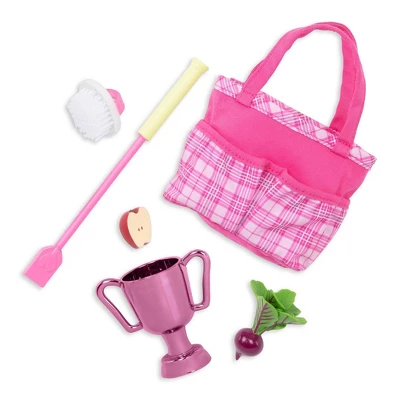 - Includes: doll, formal jacket, T-shirt, riding pants, pair of undies, boots, tote bag, helmet, brush, trophy, riding crop, beetroot, apple half, storybook, and bookmark.