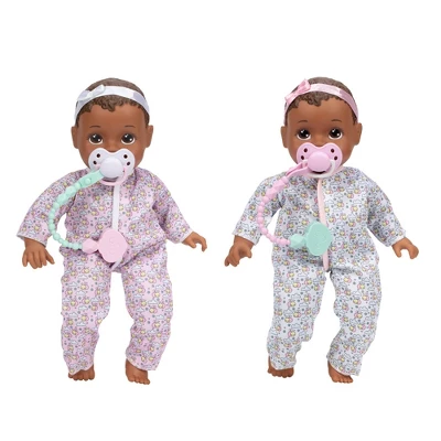 - Each twin comes with a matching milk bottle, pacifier, and pacifier clip