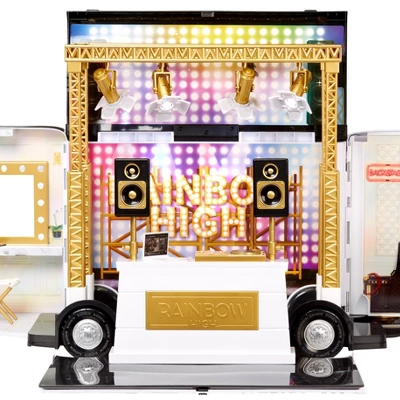 - IMAGINATVE PLAY: Bring rivalry between Rainbow High and Shadow High in your version of Rainbow Vision with this premium and modern playset. Your dolls drive the bus in style, perform live under the lights on the stage, host a DJ party with the DJ turn table, get dolled up at the light up vanity stage, or hang backstage. Customize and create with all the amazing pieces which include 14+ storytelling pieces.