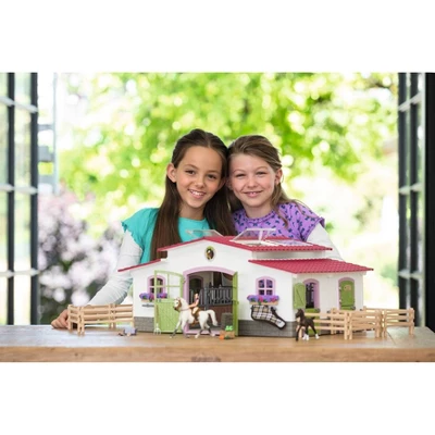 - HEALTHY IMAGINATIVE PLAY. This 44 piece playset from Schleich features a roof with paddocks that can become an open riding area, fence parts with ability to connect in any way, moveable roof window, hay racks with drinking troughs and tack holder, and other fun accessories carefully designed to inspire safe, creative play as both a single toy or part of a larger collection.